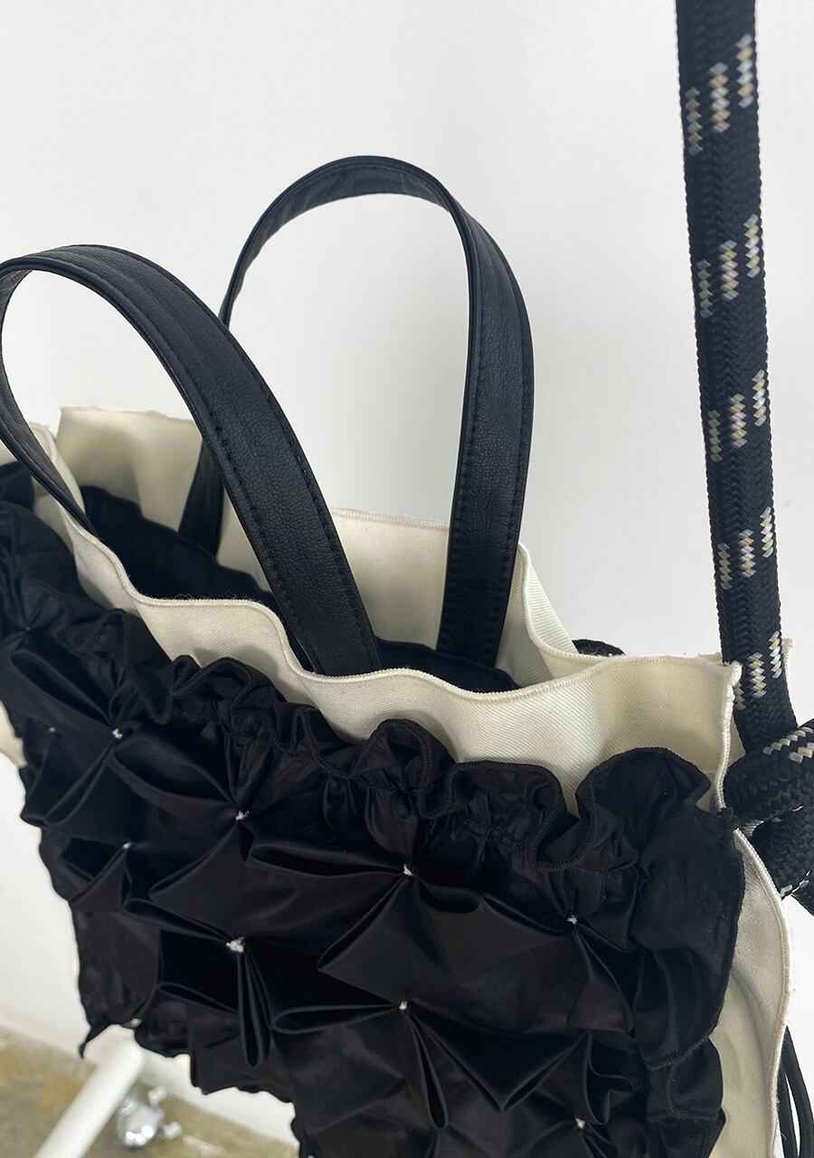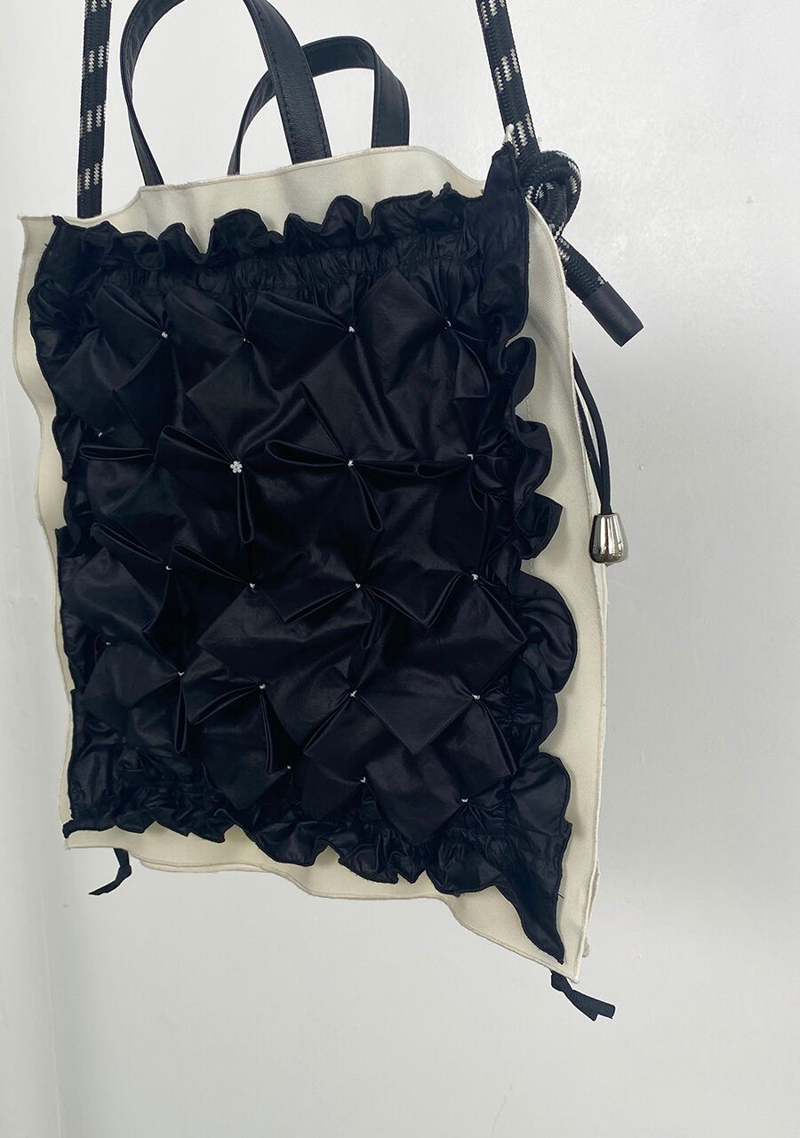 前後で異なるスモッキングが施されたデザイン。コードを絞ることで形を変えられハンドバック、肩掛けやショルダー等様々な持ち方が可能。クチュール感と機能性を兼ね備えたバック。
