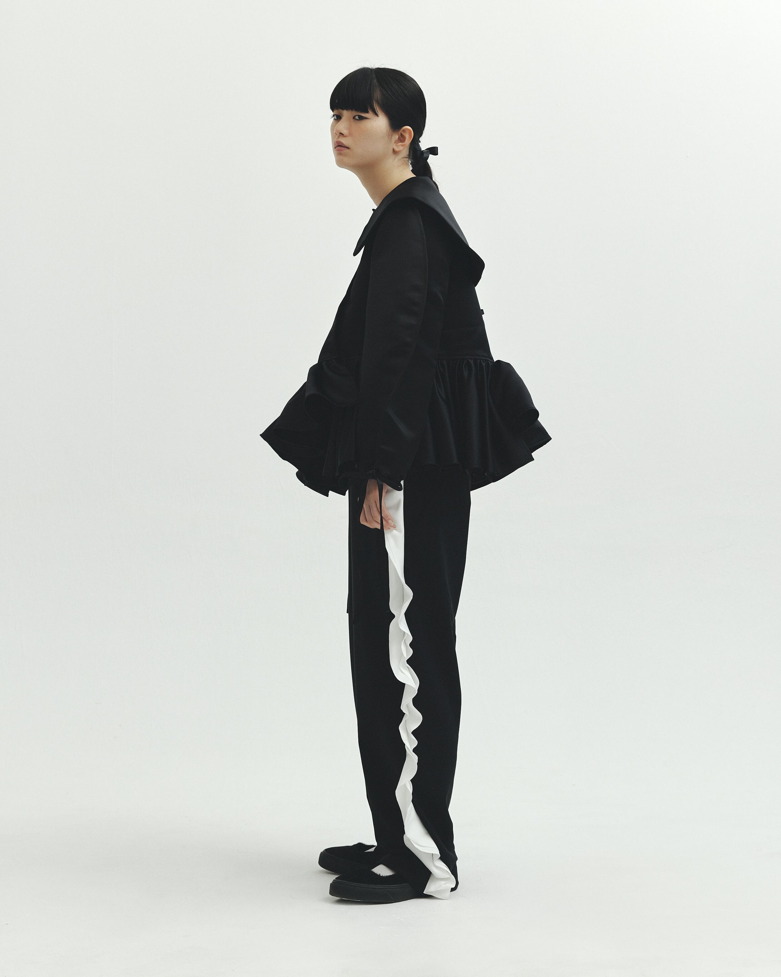 花びらのようなサイドフリルがエレガントで可愛い、履き心地の良いストレッチパンツ。