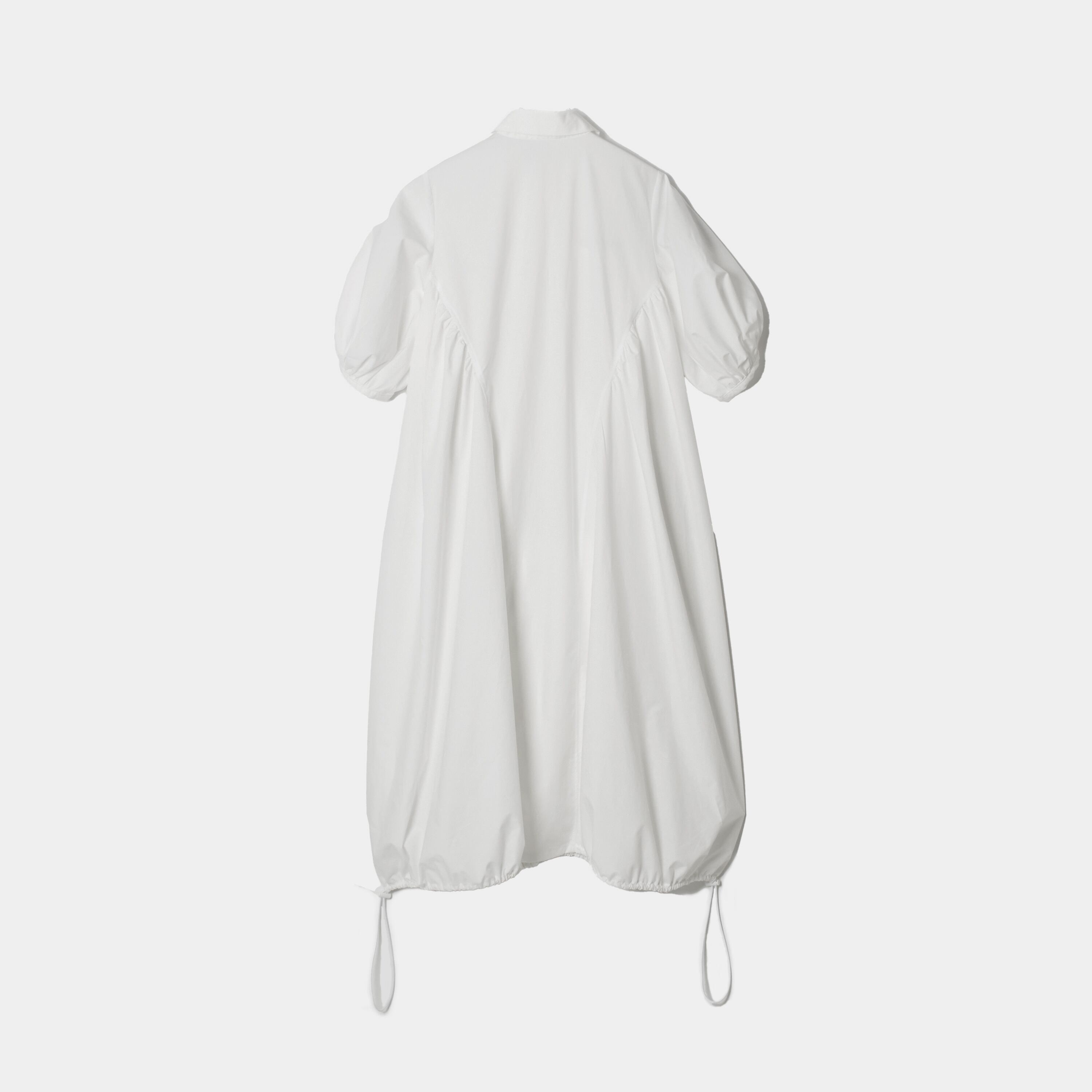 コードを調整するとバルーンシルエットになり、バストにはカッティングが施されたシャツワンピ。コードを緩めるとフレアワンピースに。中に長袖を合わせたり、羽織としてレイヤードしても可愛いです。