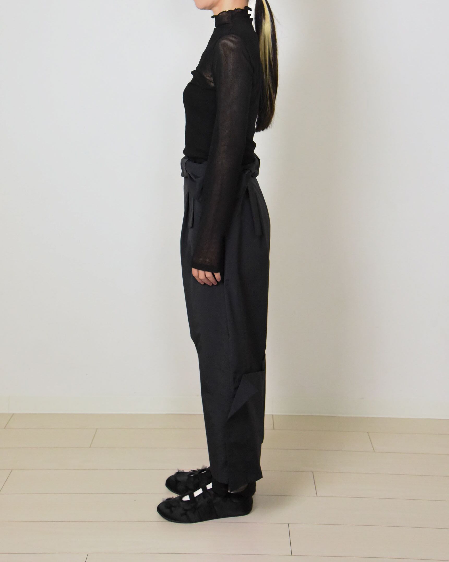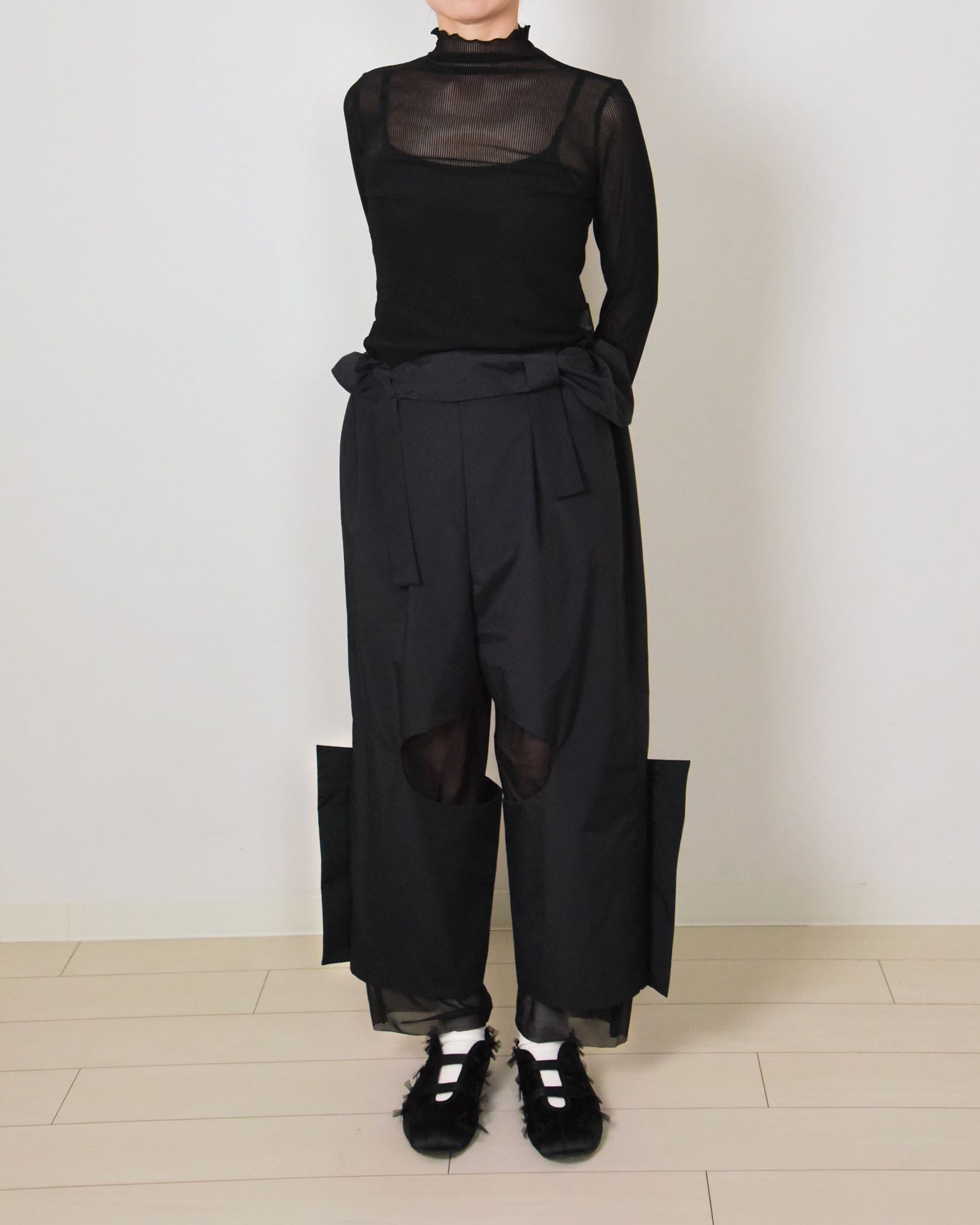 ジャンプスーツの袖をウエストで結んで着用したスタイリングから着想を得たデザイン。シースルー素材をレイヤードしたカッティングデザインパンツ。サイドウエストに一部ゴム入り。