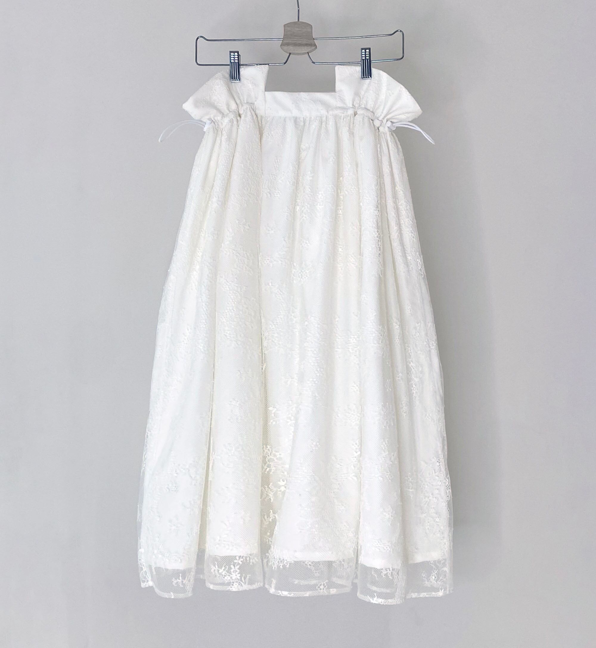 繊細なレース素材を贅沢に使用したギャザースカート。ウエストコードでサイズ調節が可能。