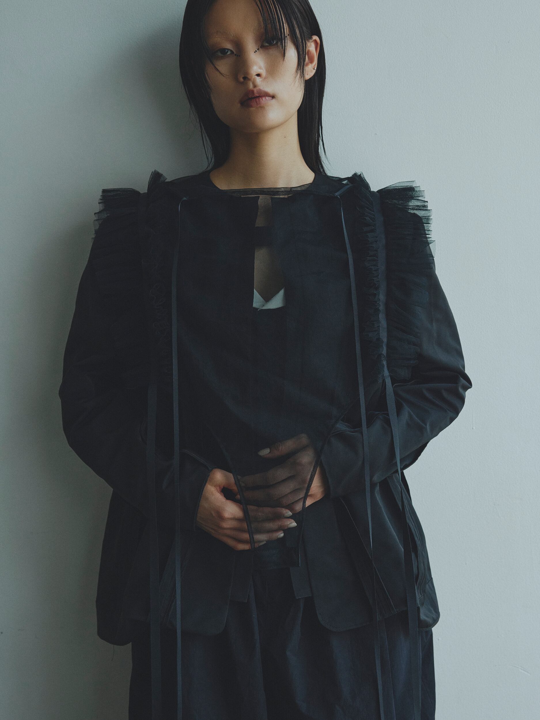 チュール素材にフリルと長めのリボンがついたレ イヤードアイテム。短めなボディスーツのようなデザインがポイント。Tシャツからジャケットまでスタイリングを華やかにしてくれるアイテム。リボンは結んでも、垂らしても可愛いです。