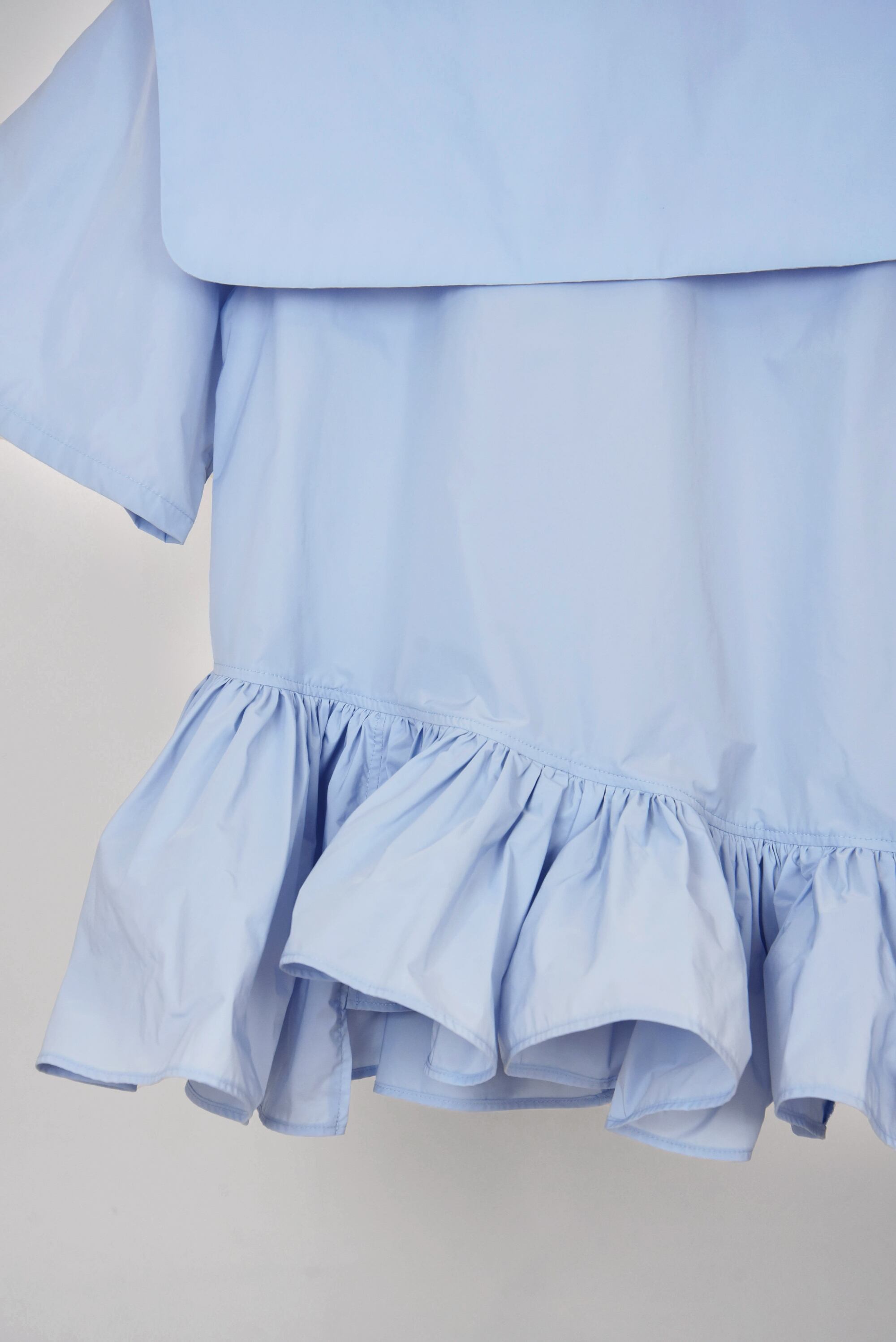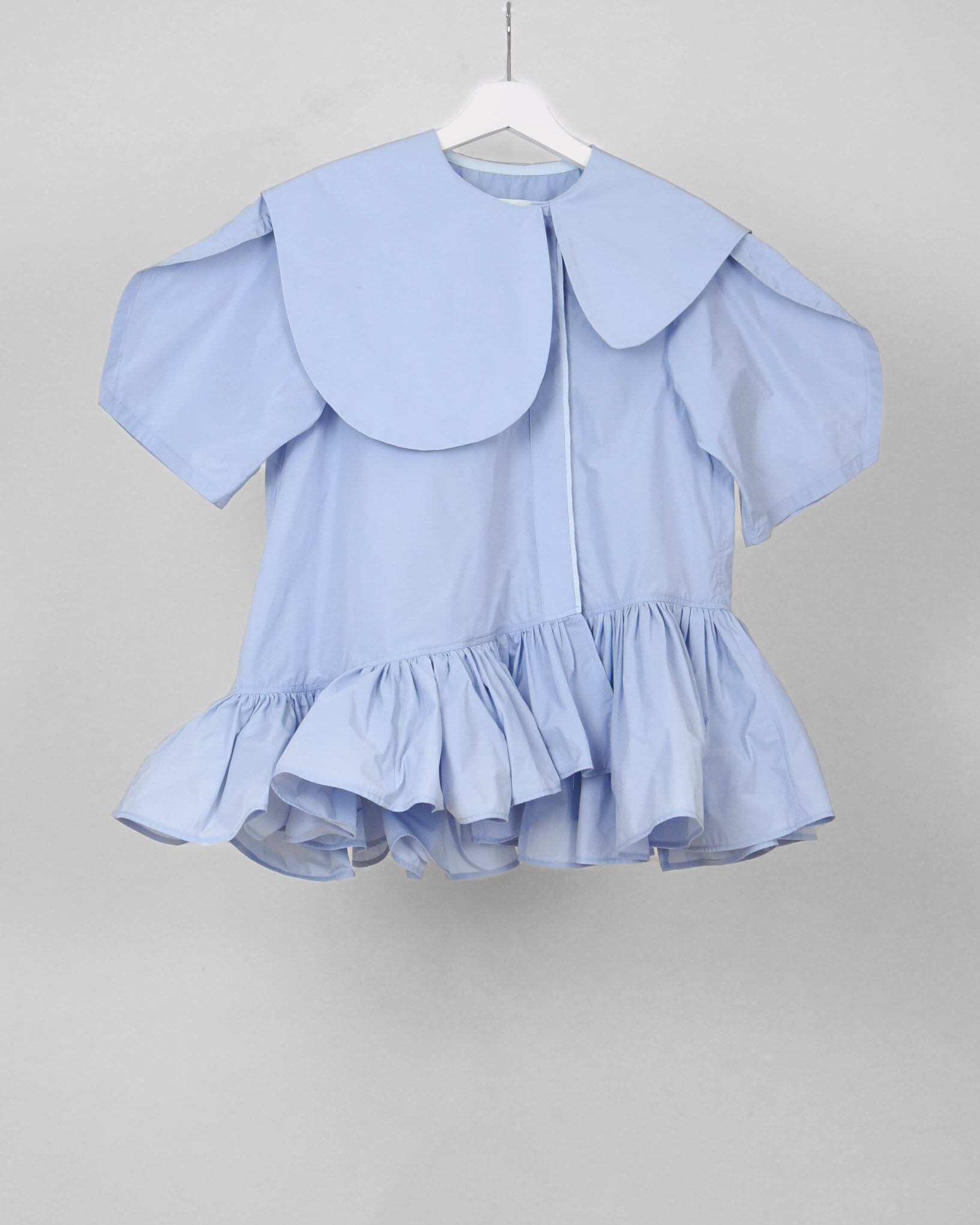 斜めになった前立と、左右非対称の襟、セーラー カラー、特徴的な袖に裾フリル。シルエット・ディテール全てにこだわった360度かわいいブラウス。